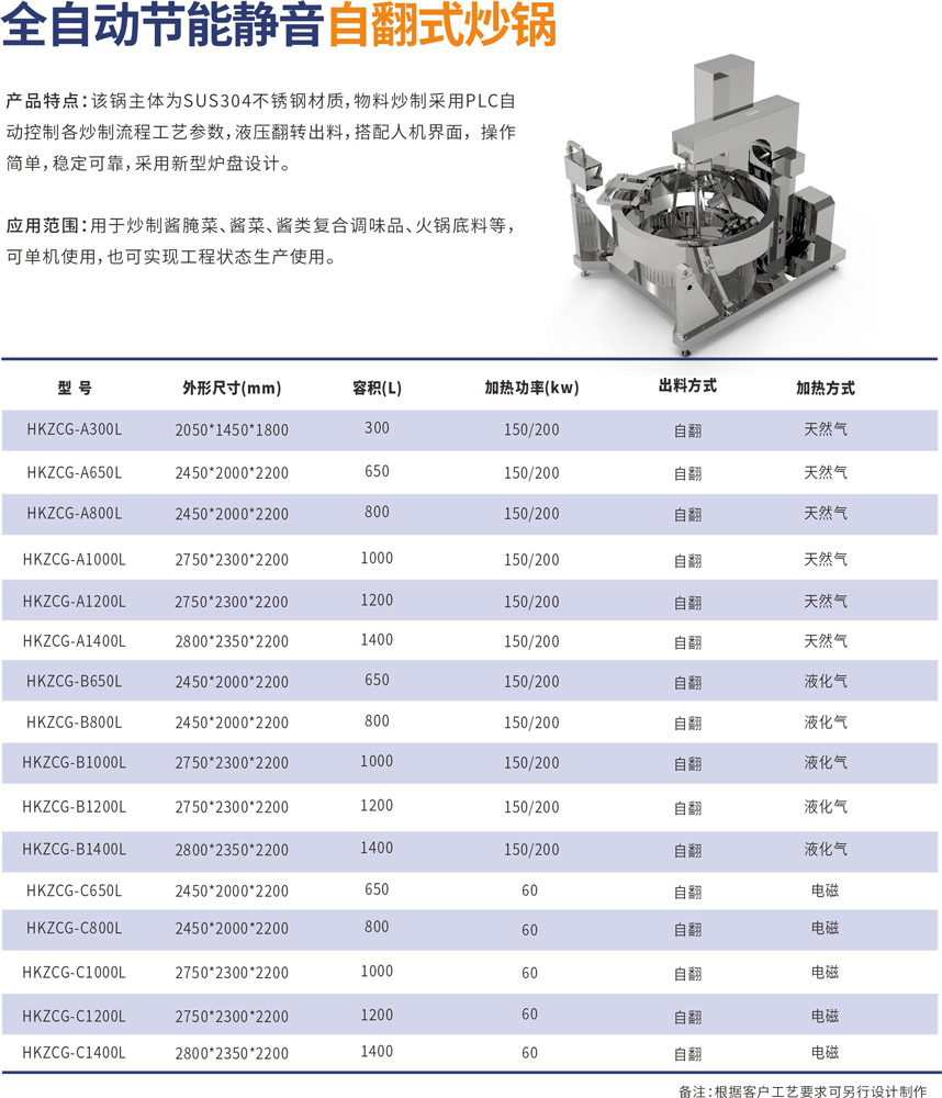 該鍋主體為SUS304不銹鋼材質(zhì),物料炒制采?PLC?動控制各炒制流程?藝參數(shù),液壓翻轉(zhuǎn)出料,搭配?機(jī)界?, 操作簡單,穩(wěn)定可靠,采?新型爐盤設(shè)計。