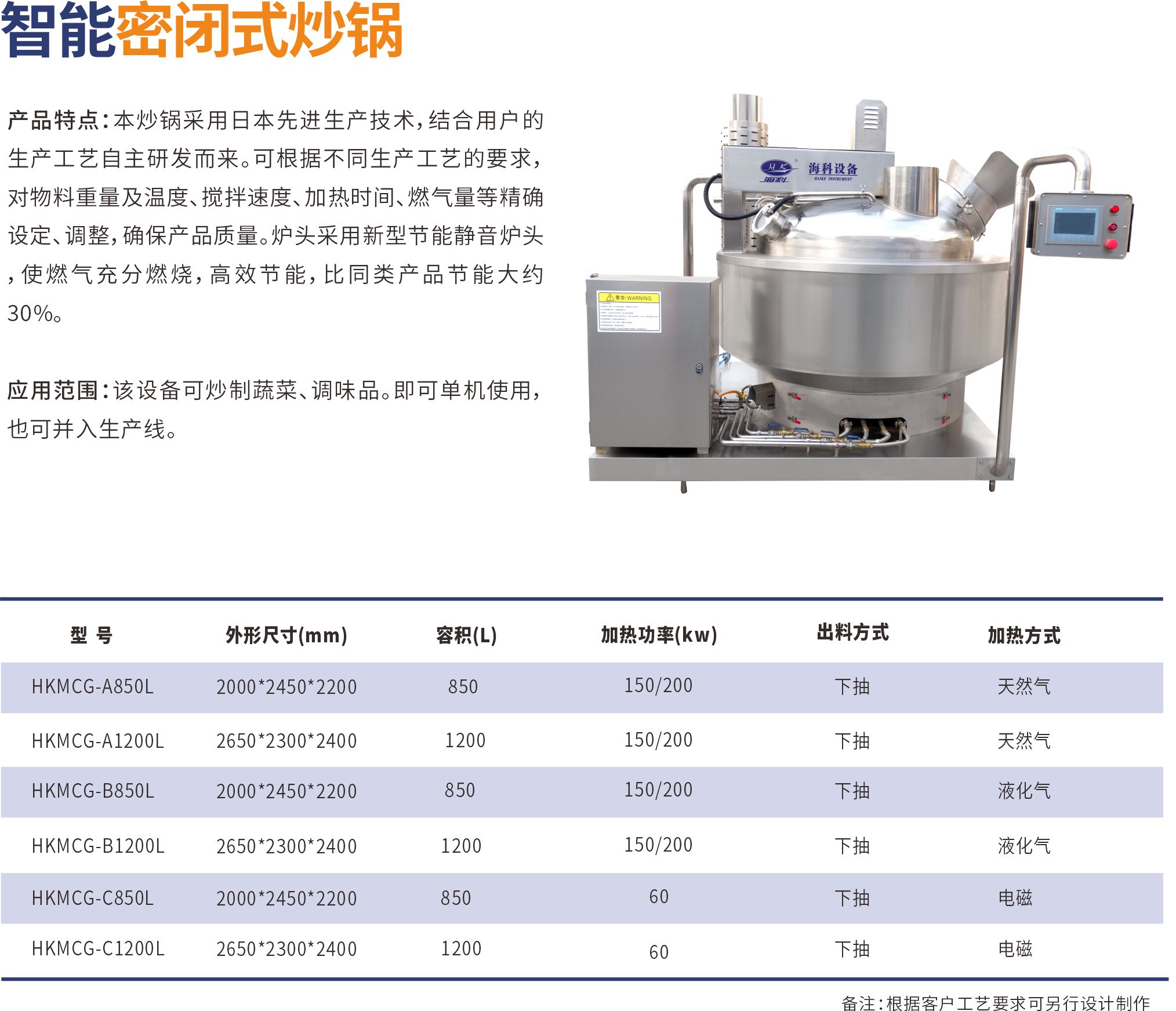 本炒鍋采用日本先進生產(chǎn)技術(shù),結(jié)合用戶的生產(chǎn)工藝自主研發(fā)而來??筛鶕?jù)不同生產(chǎn)工藝的要求,對物料重量及溫度、攪拌速度、加熱時間、燃氣量等精確設(shè)定、調(diào)整,確保產(chǎn)品質(zhì)量。爐頭采用新型節(jié)能靜音爐頭,使燃氣充分燃燒,高效節(jié)能,比同類產(chǎn)品節(jié)能大約30%。